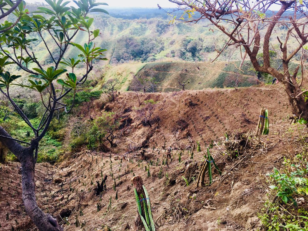 Just two years ago the ridges in the photo were a patchwork of small farms, mostly dragon fruit as this area is affected by fumes from the Masaya Volcano which affects what can be grown, and wooded patches. The rate of uncontrolled deforestation has been incredible and vast plantations of dragon fruit grown for export have taken the place of the last remaining woods. In the case of Palo Solo, where we have our 140 acre nature reserve (Canada Honda), deforestation has led to the drying up of local springs as well as the destruction of windbreaks along the ridge. The people of this very poor community are totally dependent on firewood for cooking so they have to go farther and father afield to find it.